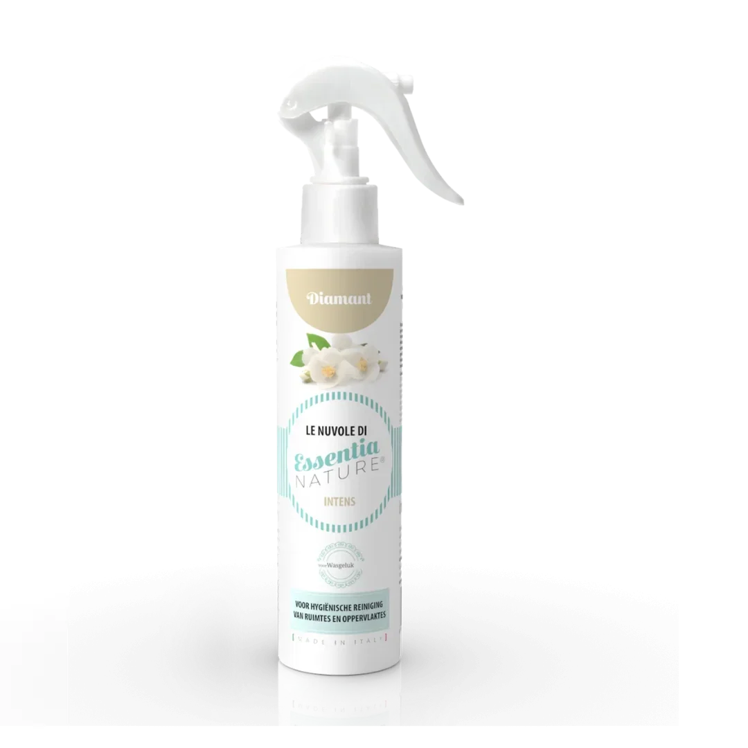 Ontdek de Cloud Diamant Intens, onze nieuwste reinigende spray uit de INTENSLIJN met een extra sterke geur. Deze geur neemt je mee op een frisse en bloemige reis, met de verleidelijke aroma's van Seringen, Muskus en Magnolia. Van dagelijkse kamers tot werkruimtes, en van gordijnen tot textiel, deze geur laat een onweerstaanbaar frisse en sensuele geursensatie achter.