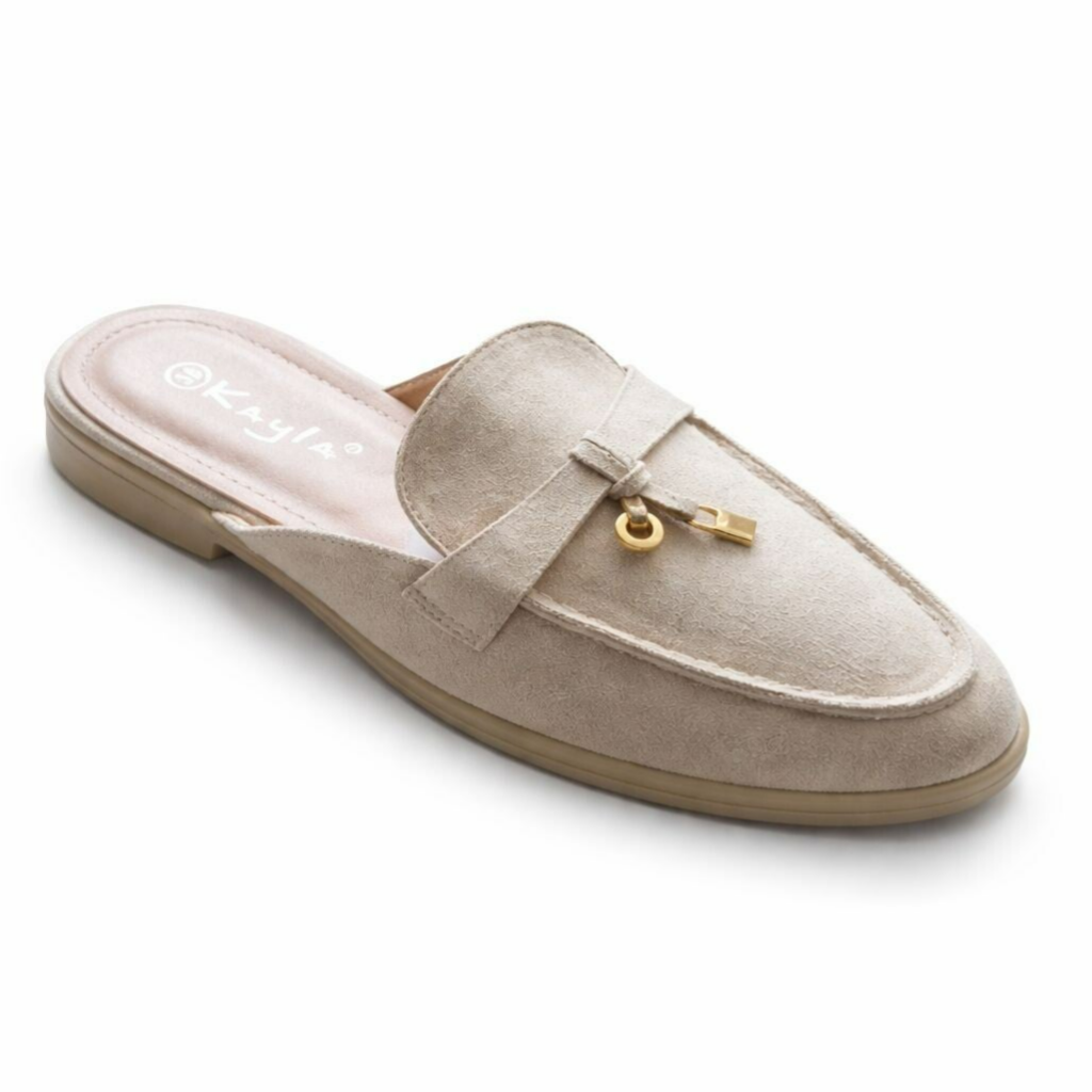 Deze stijlvolle instapper muiltjes combineren comfort met een elegante uitstraling. De schoenen zijn uitgevoerd in zacht suède in een mooie beige kleur. Het klassieke loafer-model krijgt een luxe touch door het subtiele gouden slotdetail op de wreef. Dankzij het open hielontwerp trek je ze gemakkelijk aan en uit, terwijl de comfortabele zool zorgt voor prettig loopcomfort. Perfect te combineren met zowel een casual als een nette outfit.